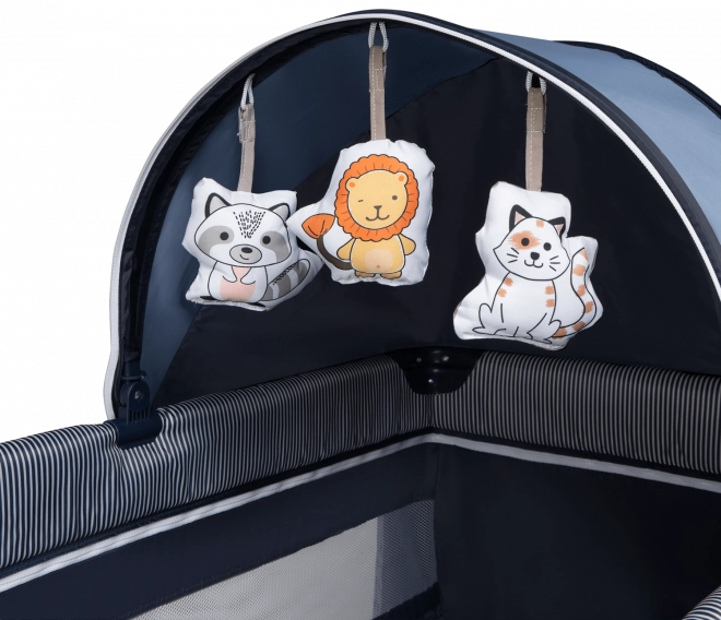 - Szúnyogháló, pelenkázó pult, oldalsó panel 3 zsebbel, felállást segítő fogantyúk, interaktív kutyus, dallamok
