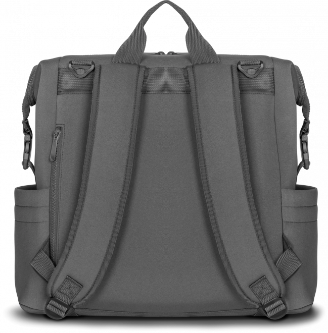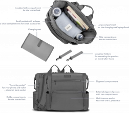 A jól átgondolt belső elrendezés gyors hozzáférést biztosít minden, a babának és a szülőknek szükséges holmihoz. Az univerzális csatok egyszerű babakocsira rögzítést tesznek lehetővé, a segédpántokkal pedig úgy állítható a méret, hogy a hátizsák a repülőn az ülés alá is beférjen.