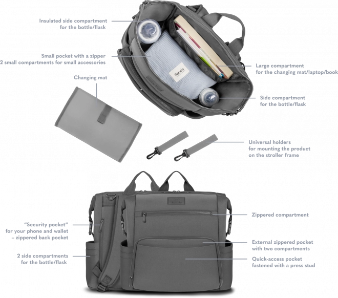 A Lionelo Cube elegáns és praktikus pelenkázó hátizsák nagy kapacitással, 12 zsebbel az átlátható rendszerezéshez és vízálló anyaggal a mindennapi használatra. Hordható hátizsákként, babakocsira rögzíthető, vagy önálló kiegészítőként is használható. Géppel mosható, és speciális rekeszben tablet vagy laptop is elhelyezhető.