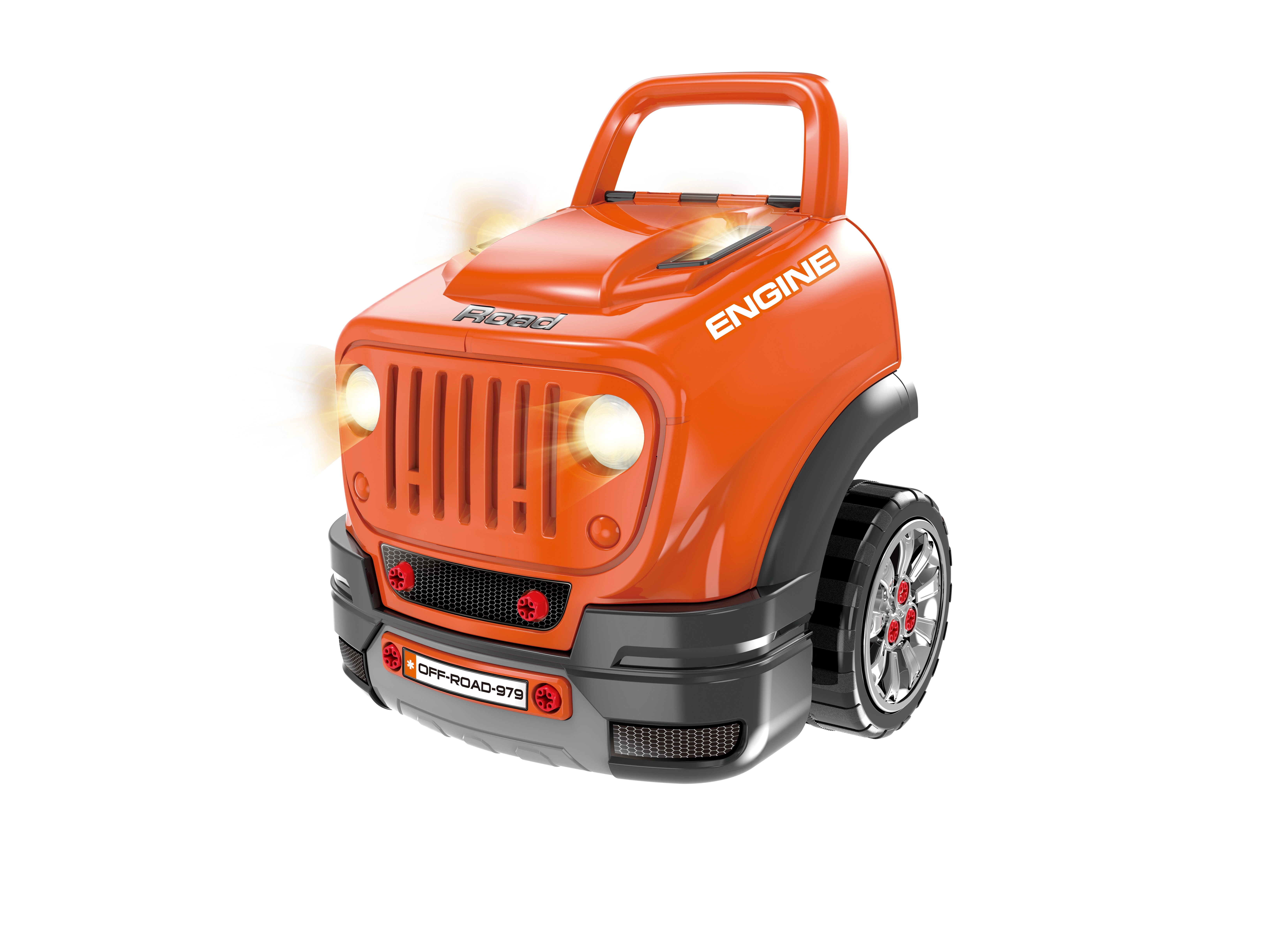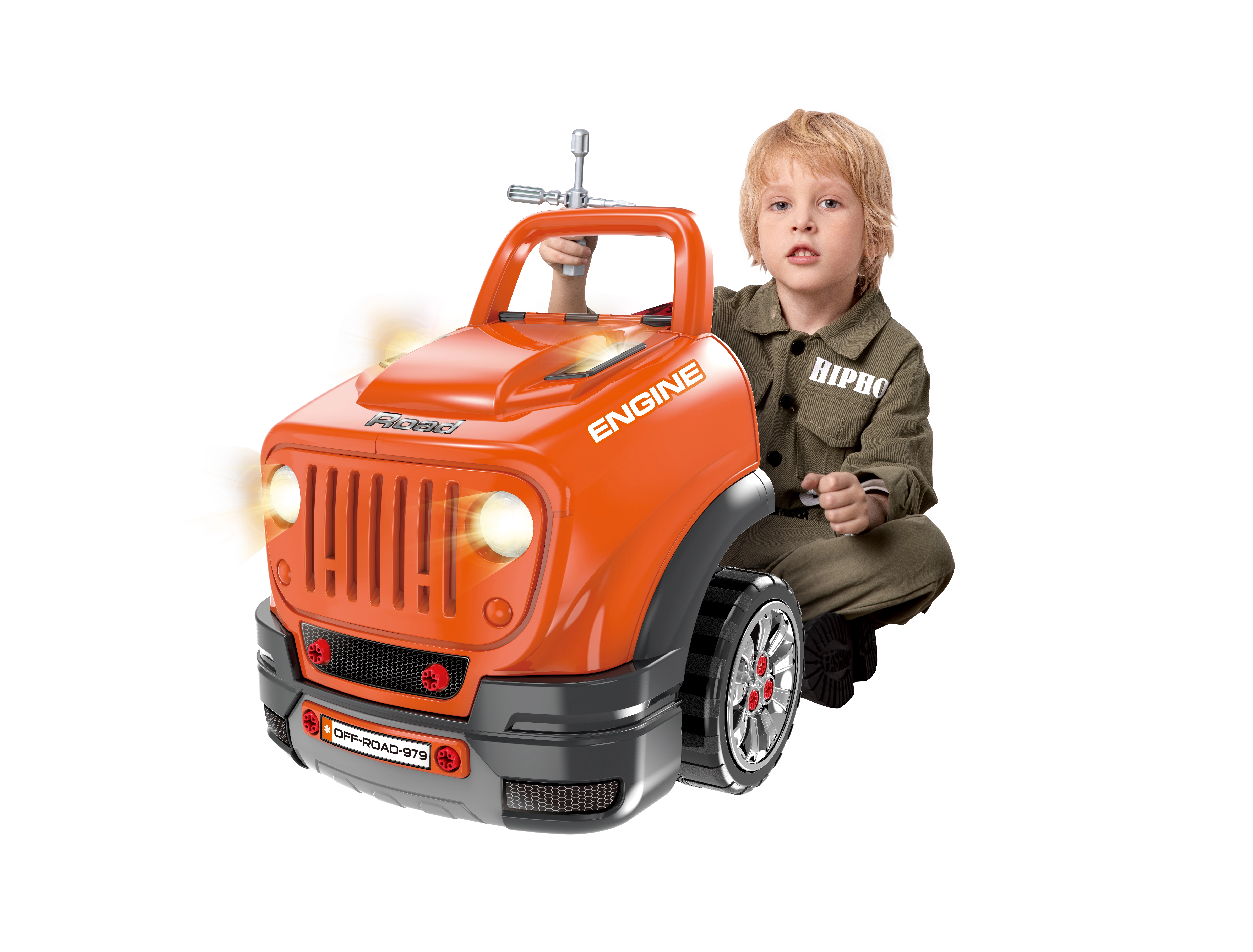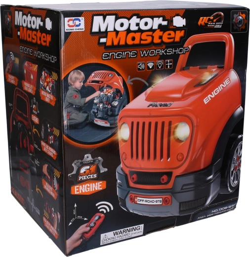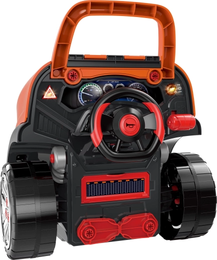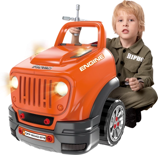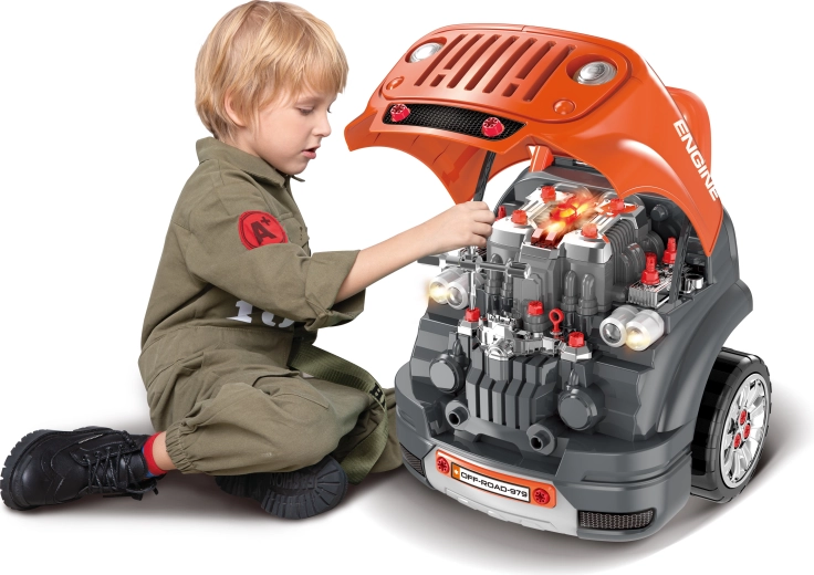 Ez a masszív, terepjáró stílusú csavarozható motor (40 × 39 × 47 cm) felfedezésekkel teli garázzsá varázsolja a gyerekszobát. A gyerekek felnyithatják a motorháztetőt, ellenőrizhetik az „olajszintet”, kapcsolhatják a vészvillogót, és felfedezhetik a részletesen kidolgozott, megvilágított motorteret. A valósághű elemek, mint a váltókar, a duda és a világító fények ösztönzik a képzeletet és a finommotorika fejlődését.
