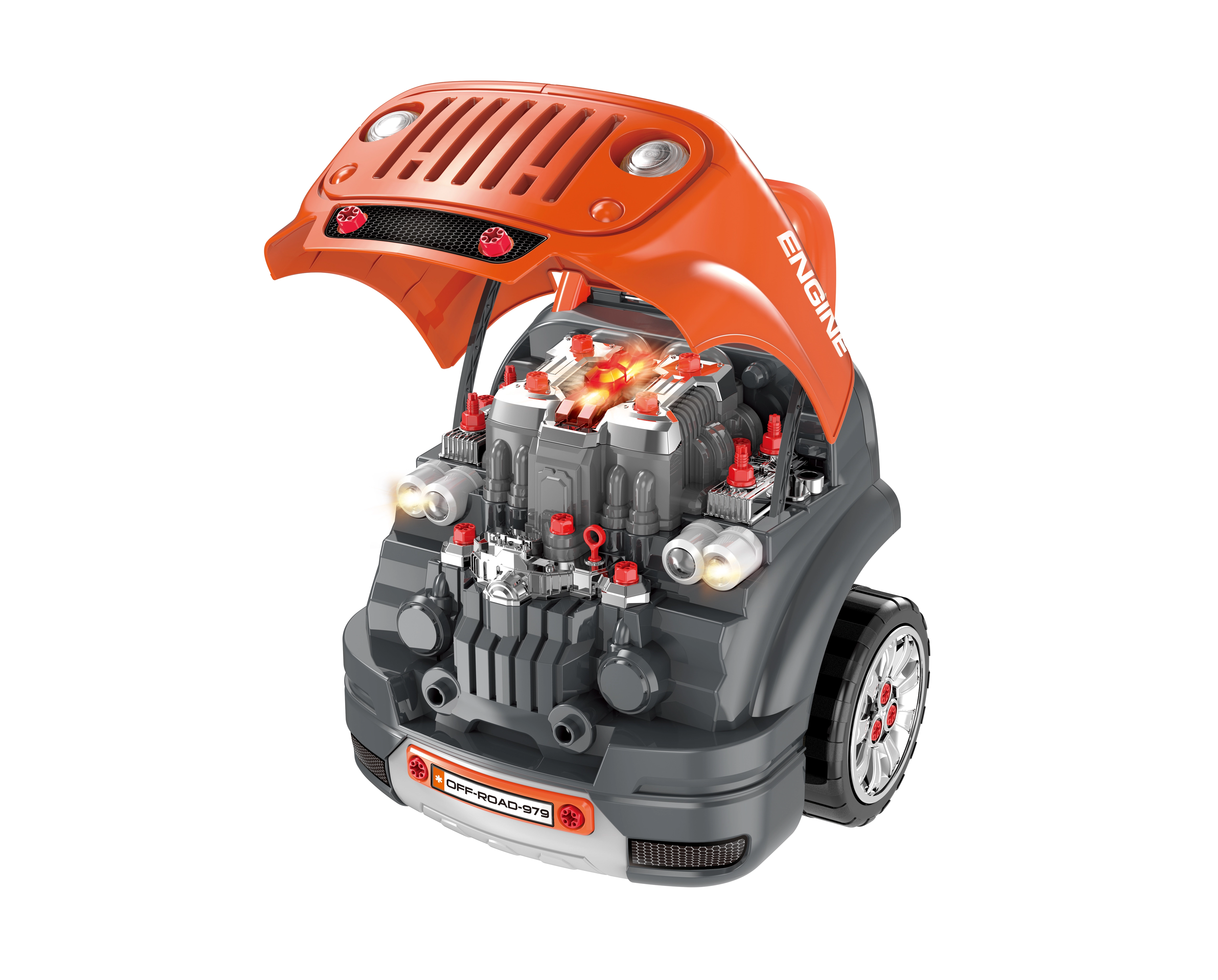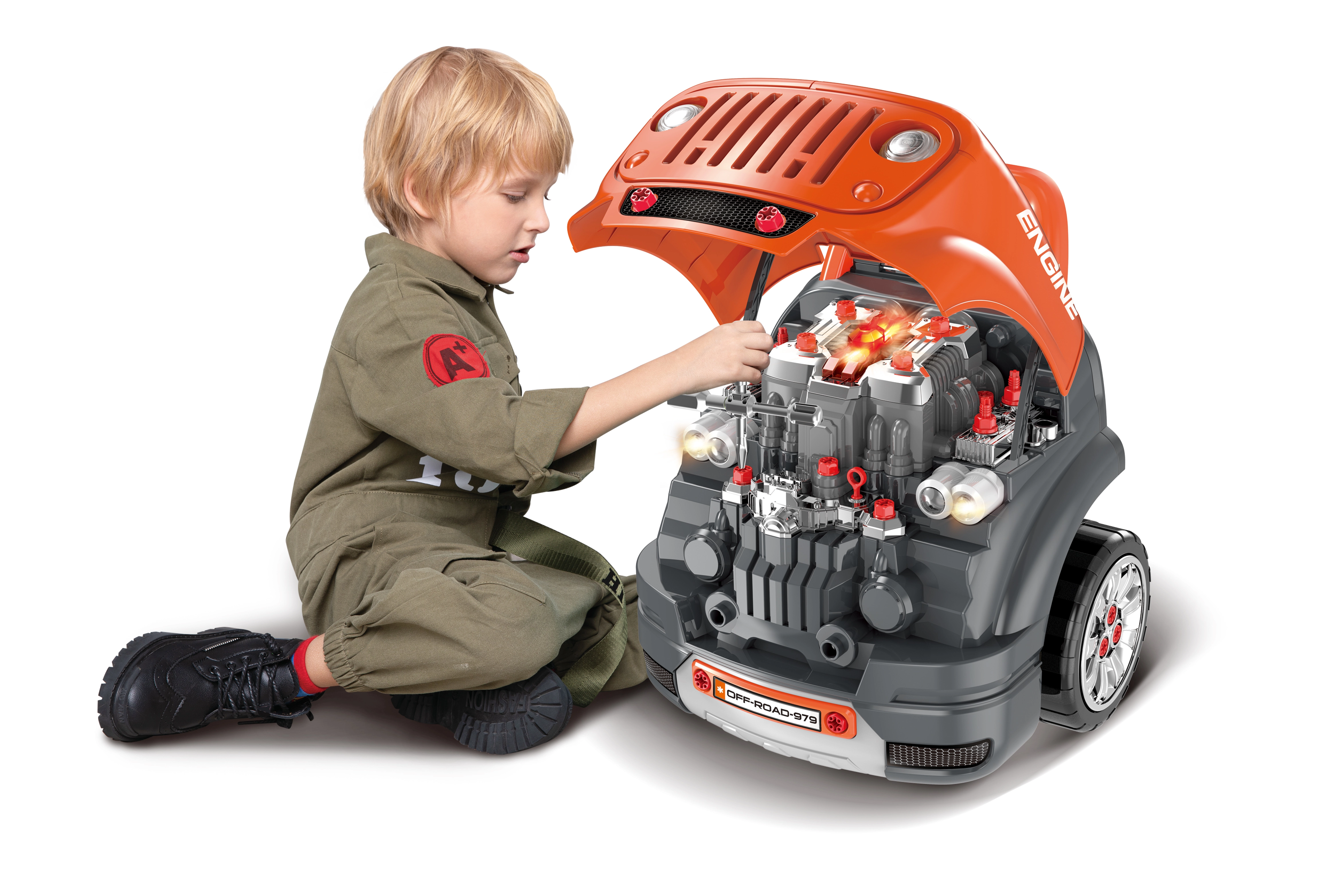Emeld fel a motorháztetőt, kapcsold fel a motortér világítását, és fedezd fel a részleteket, mint egy igazi szerelő. Ideális a kézügyesség és a kíváncsiság fejlesztésére.