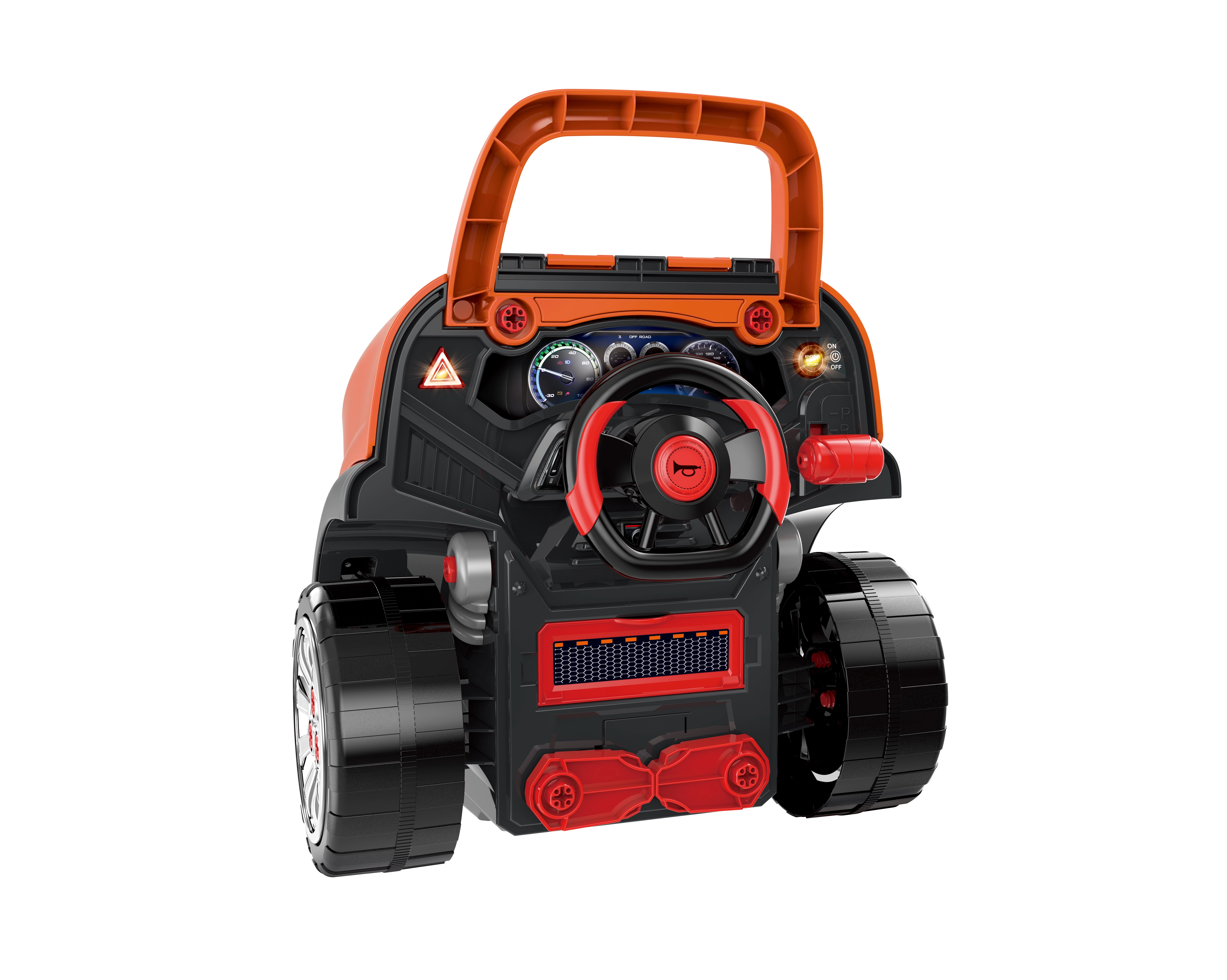 A kormány, a műszerek, a gombok és a duda bevonják a gyerekeket a játékba. A fény- és hangeffektek támogatják az érzékszervi észlelést.
