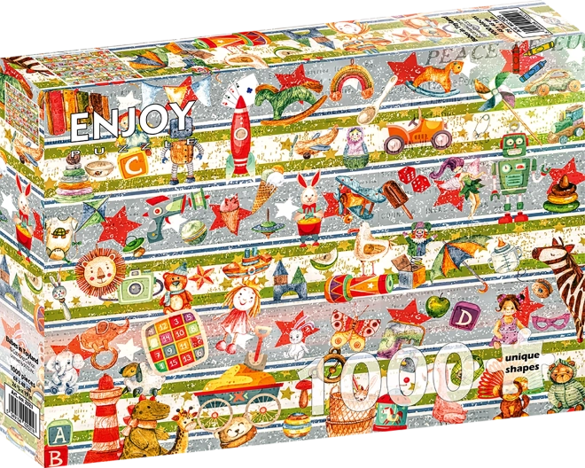 Élvezze a pihenést egy minőségi, 1000 darabos, játékbolt témájú kirakóval. A pontos vágásnak és kellemes felületnek köszönhetően átélheti a zökkenőmentes kirakást, a élénk színeket és a kényelmes formátumot az egész család számára.