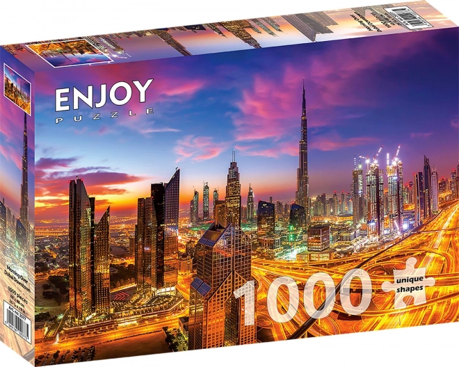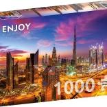 Elegáns ENJOY puzzle a Dubaj feletti hajnal témájával, 1000 részletgazdag darabbal. Élvezze a kirakózással töltött pihenést, a kb. 68 × 48 cm-es méretet és a város gyönyörű panorámáját.