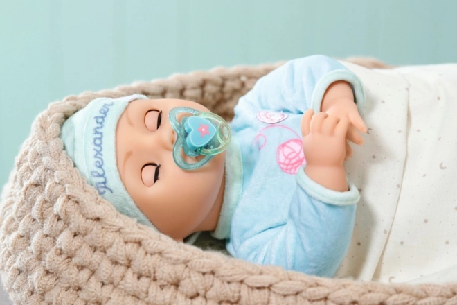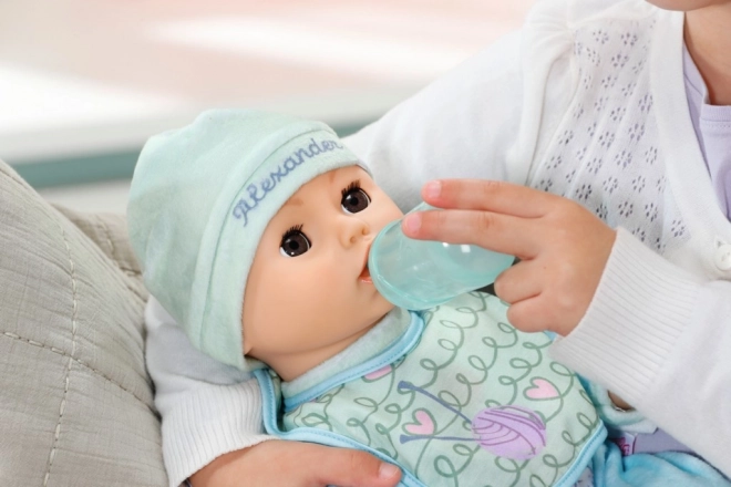 Ha alvásidő van, elég neki adni a cumit és figyelni, hogyan csukja be barna pislogó szemeit. Alexander nyafog és gügyög, amikor megkapja a cumisüvegét. Puha anyagbaba teste tökéletesen alkalmas ölelgetésre és megnyugtatásra.