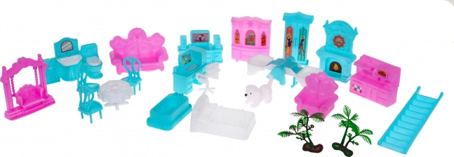 A házikó tartalmaz sok bútort és kiegészítőt, beleértve a kandallót, bútorokat és kerti elemeket.