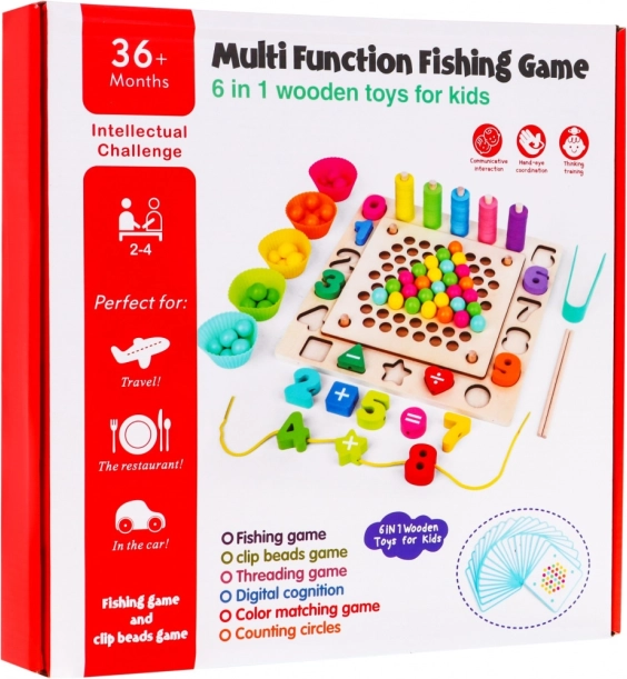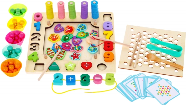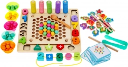 | | Ezt a játékot hároméves kortól ajánljuk. A legkisebbek számára 6 játékváltozatot tartalmaz. Horgászat horgászbottal A gyermek feladata, hogy mágneses horgászbottal halat vagy más tengeri élőlényt fogjon, ezzel gyakorolja a koordinációt, a helyes fogást és a türelmet. Gyöngyfűzés mintakártyák alapjánA gyermek húz egyet a 18 kártya közül, majd megpróbálja a lyukacsos táblán megismételni a kártyán lévő mintát, így fejleszti a vizuális észlelést, a nagymozgást, a szem-kéz koordinációt, a memóriát és a térbeli tájékozódást. Betűk és számjegyek párosítása Betűk és számjegyek párosítása A gyermek a betűket és számjegyeket a táblán lévő megfelelő mélyedésekbe rendezi, gyakorolja a gyors észlelést, térbeli tájékozódási készségeket szerez, fejleszti a kézügyességet. Színek párosítása A gyermek színes karikákat helyez a pálcikákra, igyekszik mindegyik pálcikán tíz azonos színű karikát összegyűjteni, ezzel gyakorolja a szem-kéz koordinációt és a helyes fogást. Betűk és számjegyek felfűzése zsinórra A gyermek betűket és számjegyeket fűz fel a zsinórra, fejleszti a finommotorikát, ügyességet, kreativitást és türelmet. Színes kosárkák A gyermek színes golyókat helyez a kosárkaformákba, törekszik arra, hogy mindegyik formában azonos színű golyók legyenek, megtanulja megkülönböztetni a színeket, fejleszti a motorikát és a térbeli tájékozódást. A játék teljes egészében fából készült, ezért tartós és biztonságos a gyermek számára. |
