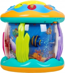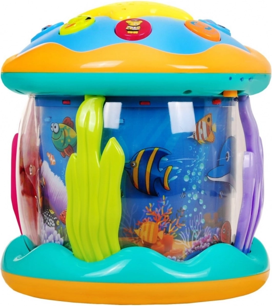 | | Interaktív lámpa fény- és hangeffektekkel, 12 hónapos kortól ajánlott. A lámpa jellemzői: - forgó projektor dekoratív elemekkel, - főkapcsoló, - izzós gomb a projektor aktiválásához és/vagy a hangerő szabályozásához, - nagy csillag alakú gomb a projektor fényeffektusainak változtatásához, - színes gombok tengeri állatokkal (tengeri csikó, polip, rák, fóka, teknős, hal), melyek az adott állatra jellemző hangokat és a zenei módot aktiválják, - dallamok, - bátor tengerész – tigris gomb, amely dallamkészletet aktivál. 17 cm x 15,5 cm. A csomagolás mérete kb. 16,5 cm x 16,5 cm x 19 cm. |