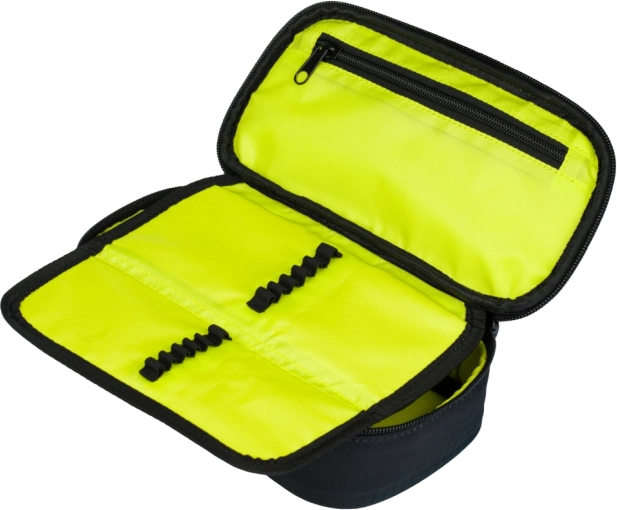 A belső tér rugalmas hurkokkal és cipzáros zsebbel van ellátva, amely lehetővé teszi az íróeszközök hatékony elrendezését.