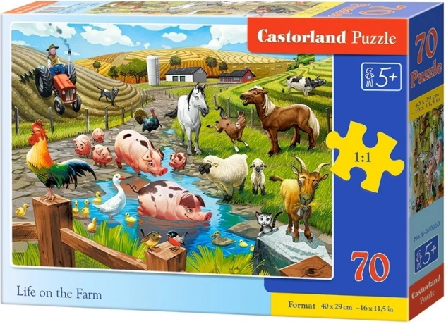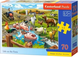 A színes, gyerekeknek készült, LIFE ON THE FARM témájú puzzle örömet szerez a legkisebb kirakóknak is. 70 darabot tartalmaz, és kirakás után 40 × 29 cm méretű képet ad. A minőségi kivitel és az élénk színek fokozzák a kirakás élményét és támogatják a készségek fejlődését.