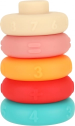 A gyűrűkön dombornyomott számok és matematikai jelek találhatók, így a gyerekek játékosan sajátítják el a színeket, a számokat és az első számolást.