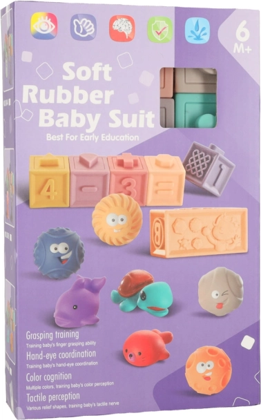Ez a szenzoros készlet egyesíti a szórakozást és a tanulást. A puha szilikon kockák számokkal és jelekkel motiválják a gyerekeket az első számolásra, miközben a változatos textúrák és domborulatok fejlesztik a tapintást és a koncentrációt. A labdák és kockák ideálisak toronyépítéshez, válogatáshoz és szabad játékhoz.
