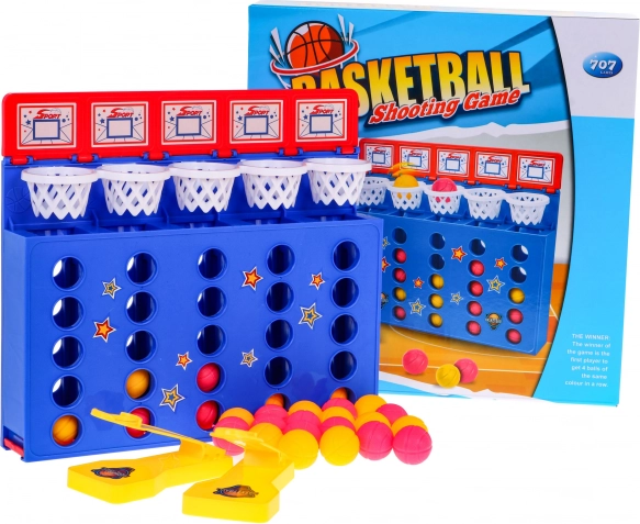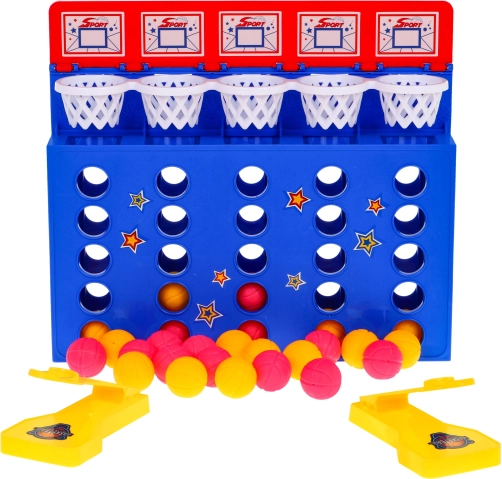 A Kosárlabda – 4 egy sorban játék ötvözi a népszerű „4 egy sorban” elvet a labdák kosárba lövésének dinamikájával. A praktikus kilövővel juttasd a labdákat a felső kosarakba úgy, hogy egy összefüggő, egyszínű sort alkossanak. Aki elsőként rak ki négyet egymás mellé, nyer!