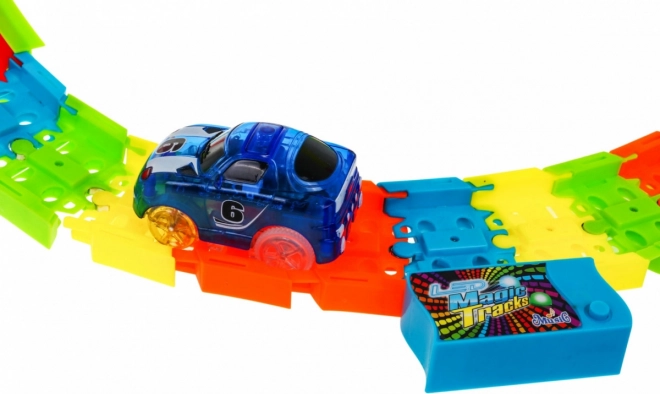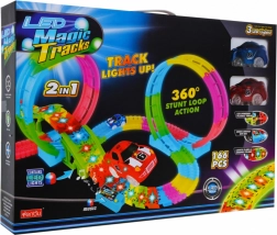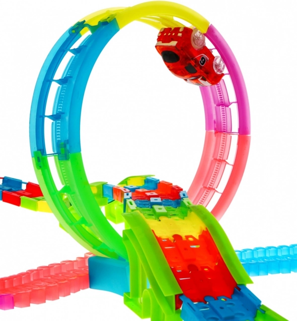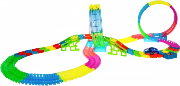 | | A hurkokkal ellátott nagy pálya 3 éves kortól ajánlott. A játék 2 x AAA elemmel működik – a pálya (nem tartozék) és 2 x AAA elemmel – az egyes autók (nem tartozék). A pálya fluoreszkál, sötétben világít, továbbá LED világítással és beépített zenei panellel rendelkezik. Az autók is világítanak, menet közben látványos fényhatásokat keltenek zenés kísérettel. Élvezd a szórakozást. |