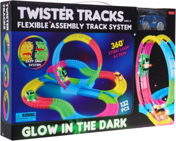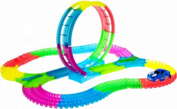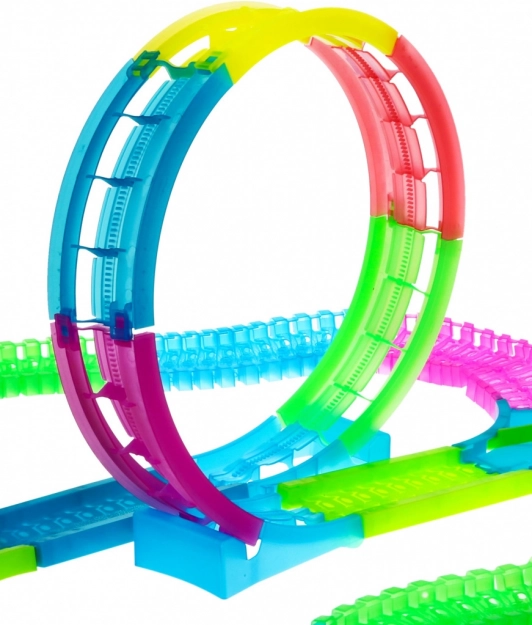 Ez a nagy világító versenypálya már 3 éven felüli gyerekek számára készült. Fluoreszkál és gyönyörűen világít a sötétben, ami a LED világítással ellátott autóval együtt csodálatos hatásokat kelt. Könnyű összeállítása és egyszerű kezelhetősége miatt nagyszerű kiegészítője minden gyermeki játéknak.