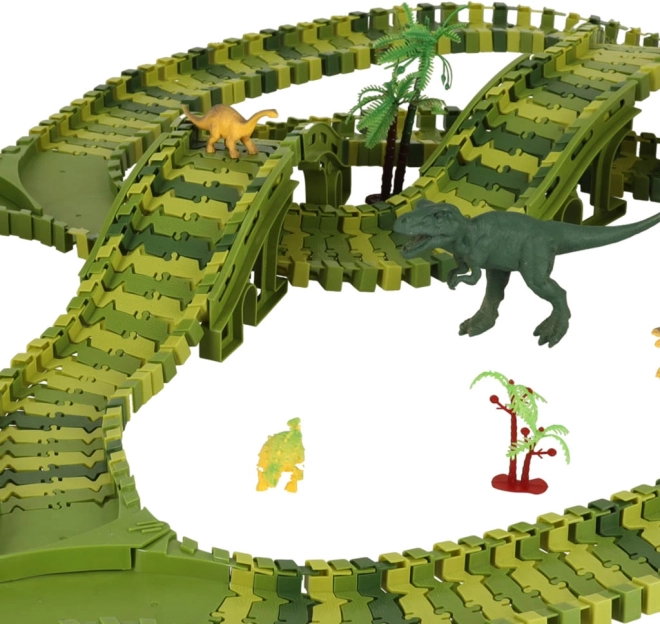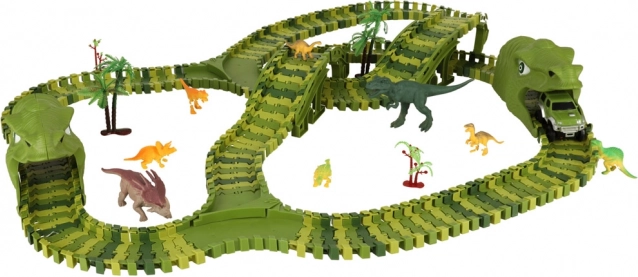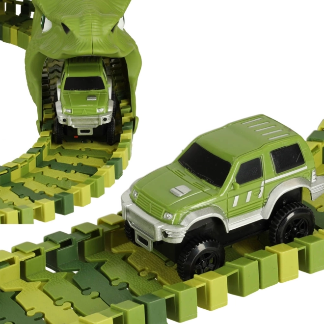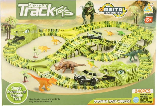 A fantasztikus dinoszauruszos versenypálya igazi csemege az őskori lények rajongóinak! A pálya rugalmas szegmensei révén különböző útvonalakat lehet létrehozni, amelyeken a kis autó száguldhat. A kiegészítő elemek, mint például alagutak vagy elágazások, további szintre emelik a szórakozást.