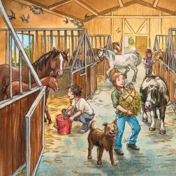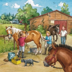 A gyerekek összerakják a lovak gondozását, az istálló életét és egy vidám tereplovaglást – mindegyik 49 darabból, élénk színekkel.