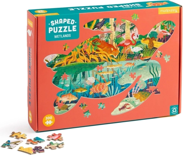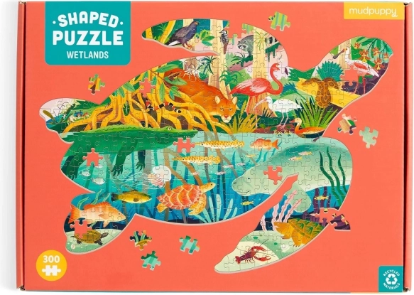 Kaley McKean illusztrátor Vizes élőhelyek témája színes utazásra viszi a gyerekeket és a felnőtteket az aligátorok, párducok, szitakötők és más élőlények közé. A kész kirakó teknős alakú, így az asztalon eredeti dekorációként is hat, és remek ajándék a természet szerelmeseinek.
