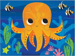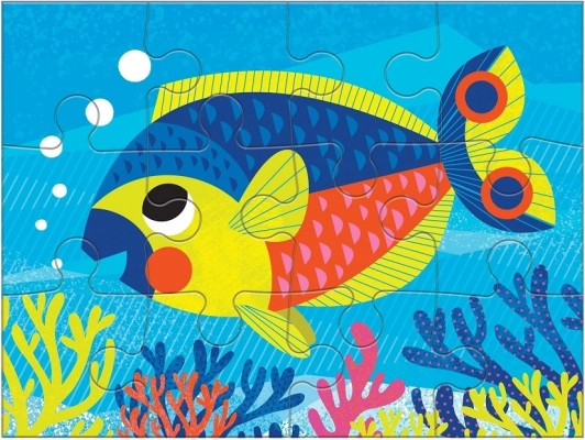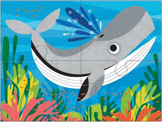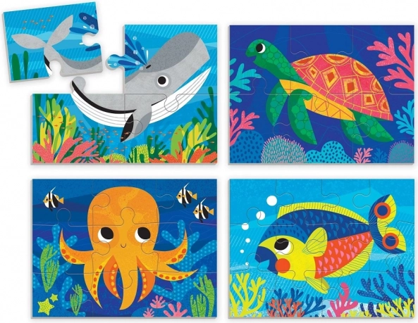 Ez a kreatív 4 az 1-ben készlet négy különálló kirakót tartalmaz a víz alatti világ kedves motívumaival – bálna, teknős, polip és halacska. A darabok újrahasznosított kartonból készültek, matt felülettel a szép színekért és a kellemes tapintásért. Minden kirakó eltérő darabszámú (4, 6, 9, 12), így a gyerekek lépésről lépésre haladhatnak, fejlesztve finommotorikájukat, türelmüket és logikus gondolkodásukat.