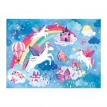 Színes illusztráció egyszarvúakkal, szivárvánnyal és pillangókkal, amely ösztönzi a kirakást, a képzeletet és a türelmet.