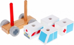 Ez a fa mentőautó ideális első építős és motorikus játékokhoz. A gyerekek a négy kockát az alap két pálcikájára helyezik, és saját járművet raknak össze az ismert mentőszolgálati szimbólumokkal. A rugalmas kerekek sima gurulást biztosítanak a padlón, miközben fejlesztik a képzelőerőt és a tematikus mentős szerepjátékot.