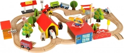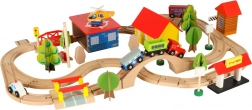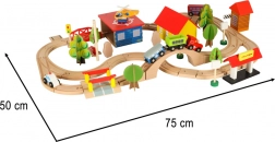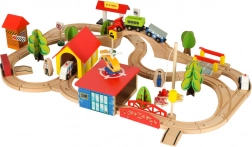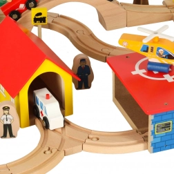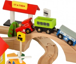 Fedezze fel a korlátlan lehetőségeket ezzel a színes fa vonatkészlettel. A készlet tartalmaz állomást, hidakat, helikopter-leszállóhelyet, figurákat és további elemeket, amelyek lehetővé teszik saját kisváros megalkotását.