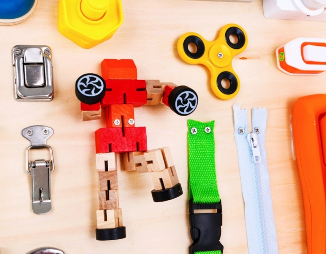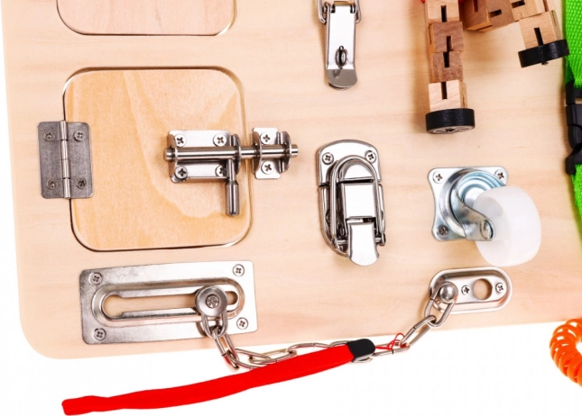 A tábla számos interaktív elemet tartalmaz, mint például zárakat, kapcsolókat és visszacsatoló mechanizmusokat, amelyek támogatják a finommotorika fejlesztését és az ok-okozati kapcsolatok megértését.