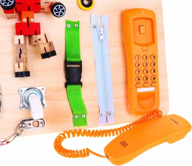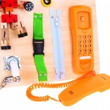 A tábla különböző játékelemeket tartalmaz, mint például pörgettyűt, telefont és csengőt. Ezek a részek játékká változtatják a tanulást, amelyet a gyerekek imádni fognak.