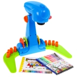 A gyermekeknek készült rajzoló projektor ideális választás a fiatal művészek számára. Tartalmaz 32 mintát 4 korongon, amelyeket könnyen megjeleníthet és átrajzolhat a mellékelt filcekkel. A projektor magassága állítható, és nagyon könnyen kezelhető – csak tegye be a kiválasztott korongot, és a rajzok megjelennek a kiválasztott területen.