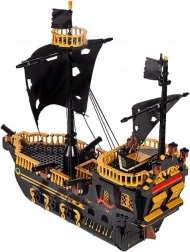 A hajó részletes elemekkel készült, amelyek egy valódi kalózhajót idéznek, fekete vitorlákkal és arany díszítésekkel.
