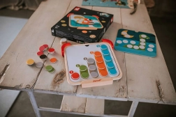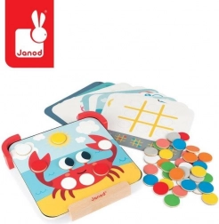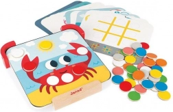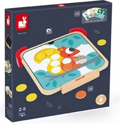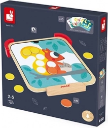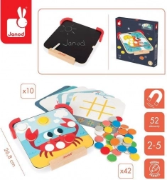 A JANOD Színeket tanulok mágneses fejlesztő játék átfogó tevékenységet kínál a kis felfedezőknek. A készlet része egy talpakkal ellátott mágneses fa tábla, 42 színes mágneses korong, 10 kétoldalas feladatkártya és kréta. A gyerekek a minták szerint a megfelelő helyre helyezik a mágneseket, gyakorolják a színeket, mintákat és a koncentrációt – a táblát pedig rajzolásra, az első betűk és számok próbálgatására is használhatják.