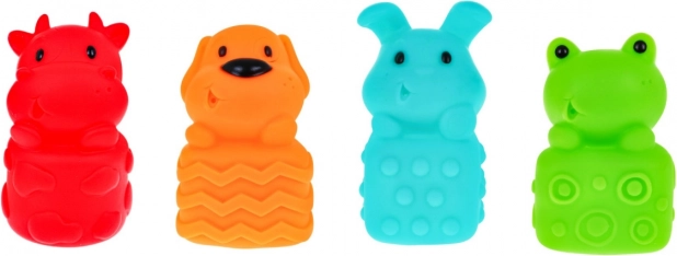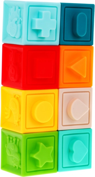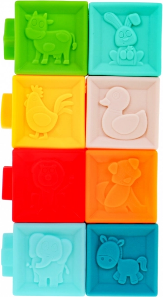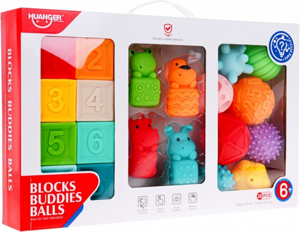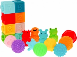 | | Puha, biztonságos szenzoros játékok készlete 6 hónapos kortól. A játékok 100%-ban gyermekbarát anyagokból készültek. Fejlesztik a képzeletet, a gondolkodást, a látást és a hallást. A készlet elemei szabadon összenyomhatók, ami erősíti a kéz izmait. Összenyomáskor hangot adnak, ami felkelti a gyermek érdeklődését. A készlet 20 elemből áll: 4 állatfigura, 8 labda és 8 kocka. Minden elem más felületű és színű, így változatos ingereket biztosít a gyermek érzékszervei számára. |