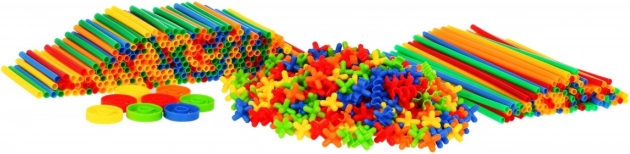 - 100 hosszú szívószál, - 300 rövid szívószál, - 400 különböző alakú csatlakozóelem, - pattintós tárolóedény, - képes útmutató. | ||