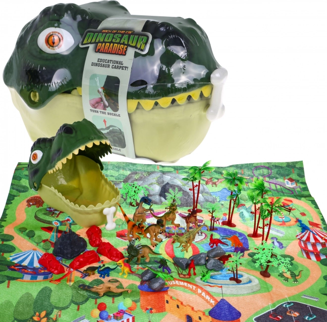 Ez a szórakoztató és oktató készlet minden kis paleontológus kedvence lesz. A nagy műanyag dínófej tárolódobozként szolgál kihúzható fogantyúval, így a gyerekek az egész világot könnyedén magukkal vihetik. Belül filc játszóalátétet találsz parki motívummal és egy színes válogatást gumiból készült dínófigurákból, fákból, sziklákból és egy vulkánból a valósághű jelenetekhez.