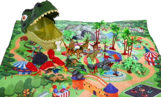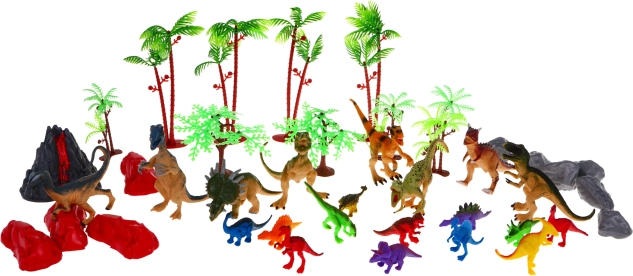 Különböző méretű dinoszaurusz figurák, fák, sziklák, kövek és egy vulkán teszik lehetővé hiteles őskori jelenetek és történetek megalkotását.