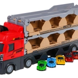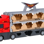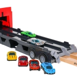 | | Nagy, masszívan megépített, háromszintes teherautó katapulttal 3 éves kortól. A kamion gumibroncsokkal és kétkerekes hajtással rendelkezik. A jármű tetején praktikus hordfogantyú található, így bárhová magaddal viheted. A játéknak 3 szintje van, amelyekre nagy mennyiségű kisautó helyezhető el (a készlet 6 kisautót tartalmaz). A szintek kihajtása után akár 207 cm hosszú, nagy pálya alakul ki a kisautók számára. A teherautó járműkatapulttal rendelkezik: csak helyezd a járművet a legalsó szintre, és nyomd meg a tetőn elhelyezett kart. A teherautó előrelövi az autót, amely a kihajtható pályán halad tovább. A játék nem igényel elemeket. A teherautó funkciói: - Kényelmes hordfogantyú, - Állvány a járműveknek, - Autókatapult, - Kétkerekes hajtás. |