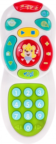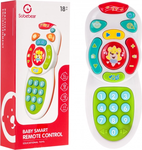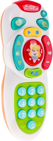 Interaktív, multifunkciós távirányító hang- és fényhatásokkal, 18 hónapos kortól. A játék a legjobb minőségű műanyagból készült, éles szélek nélkül. Nagy gombokkal rendelkezik a hang- és fényhatások aktiválásához, így a kisgyermekek apró kezei is kényelmesen kezelhetik. Minden gomb alatt vidám dallamok és hangok találhatók, továbbá van egy gomb a játék indítására és leállítására, valamint egy hangerőszabályzó gomb. A távirányító közepén egy nagy gomb medve rajzzal található, amely zenelejátszás közben villog. A távirányító felső részén lévő TV feliratú gomb szintén háttérvilágítást kap. A játék 3 x 1,5 V AAA elemmel működik, az elemek nem tartozékok. .A játék specifikációi: .- mesés színek, .- beépített dallamok készlete, .- további hangok – szívdobbanás, állathangok, számok 0–9 angolul, .- villogó LED a medvés gombon, .- a TV gomb felgyullad bármely gomb megnyomásakor, .- nagy billentyűzet számmal jelölt gombokkal, .- hangerőszabályzás. |