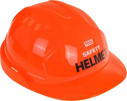 A narancssárga védősisak teljessé teszi a kis építő szerepét, és megtanítja a szerszámhasználat alapvető biztonsági szabályait.
