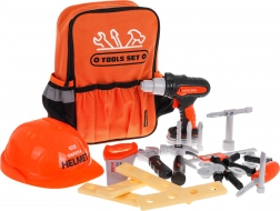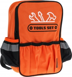 A hátizsák tartós textilből készült, cipzáras főrekesszel, oldalsó és első zsebekkel, valamint állítható pántokkal a kényelmes viseléshez. A készletben fűrész, kalapács, csavarhúzó bitekkel, kulcsok, csavarok anyákkal és szerelőlapok is találhatók – mindez gyerekbarát, könnyű és tartós kivitelben.