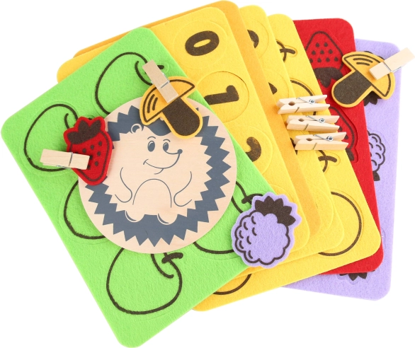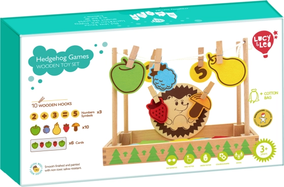 A készlet tartalmaz egy fából készült alapot, süni figurát, szórakoztató kártyákat és színes filc alátéteket - ideális csoportos játékhoz is. A könnyű tárolás érdekében minden praktikus pamut tasakban van csomagolva.