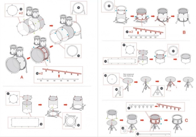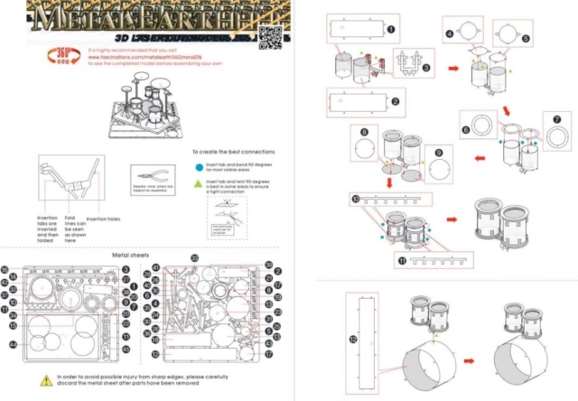 Az egyes elemeket vegye ki a fém lapokból; szükség esetén használjon kis csípőfogót (nem tartozék). Az alkatrészeket reteszekkel kell egymáshoz rögzíteni, amelyek egy fülecskéből és egy nyílásból állnak. A fülecskét kis, vékony fogóval (nem tartozék) hajlítsa meg, és fokozatosan rögzítse az összes reteszt, míg egy nagyon élethű remekművet nem kap!