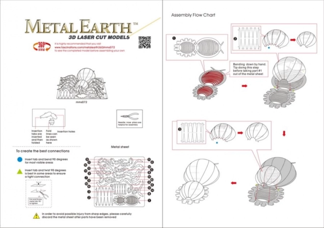 Az egyes alkatrészeket válassza le a fémlapokról; szükség esetén használjon kis vágócsípőt (nem része a csomagnak). Az elemeket reteszek segítségével kell összekapcsolni, amelyeket egy kampó (fül) és egy nyílás alkot. A fület kis, vékony fogóval (nem része a csomagnak) hajlítsa meg, és fokozatosan zárja össze az összes reteszt, míg végül egy rendkívül élethű mestermű születik!