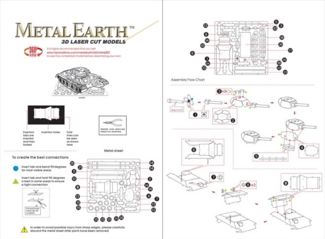 Az egyes darabokat emelje ki a fém lapokból; szükség esetén használjon kis csípőfogót (nem tartozék). Az alkatrészeket reteszek segítségével kell egymáshoz rögzíteni, amelyeket fülecske és nyílás alkot. A fülecskét kis, vékony fogóval (nem tartozék) hajlítsa meg, és fokozatosan rögzítse az összes reteszt, míg egy rendkívül élethű remekmű nem lesz a kezében!