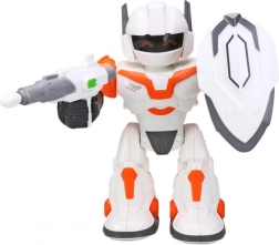Szórakoztató, elemes robot, 20 cm magas, amely akciódús látványról gondoskodik: sétál, fény- és hangeffektekkel rendelkezik, 360°-ban forog, és a kezében fegyvert és pajzsot tart.