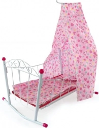 A bájos, 38 cm-es babákhoz való fém bölcső kis gondozóállomássá varázsolja a gyerekszobát. Stabil fémvázat, baldachinos textilborítást és puha ágyneműszettet – vékony takarót és kis párnát – kínál a realisztikus anyaszerepjátékhoz és a babák megnyugtató altatásához.