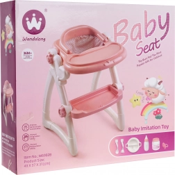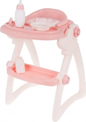 Nagyméretű baba etetőszék 7 részes kiegészítő készlettel örömet okoz 3 éves kortól. Kényelmes ülőkével, praktikus tálcával és kiegészítőknek való polccal rendelkezik. Minőségi műanyagból pasztell színekben készült, és biztonságos – éles élek nélkül, ideális a babák etetésének és gondozásának eljátszásához.