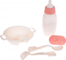 A csomag gazdag kiegészítőkészletet tartalmaz, amely ösztönzi a fantáziát és fejleszti a finommotorikát: cumisüveg, cumi, hintőpor tégelyben, kanál, villa és osztott tál. Remek a mindennapi „anyukás-babás” játékokhoz.