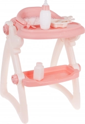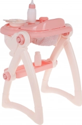 A magas etetőszék úgy néz ki, mint az igazi – kényelmes ülőkével, tálcával és alsó polccal a kiegészítőknek. Ideális a babák etetésének és gondozásának eljátszásához.