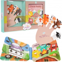 Szórakoztató készlet 3 éves kortól: 5 gumiból készült ujjbáb (tyúk, kutya, szamár, tehén, bárány) és egy puha, vízálló könyvecske sípolóval. Ideális bábszínházhoz, a képzelet és a finommotorika fejlesztéséhez. Biztonságos kivitel éles szélek nélkül, a könyvecske szövege angol nyelvű.