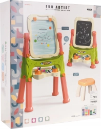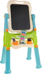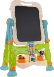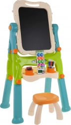 Kétoldalas, 2 az 1-ben gyerektábla 3 éves kortól kis művészeknek: mágneses fehér tábla és krétás fekete felület, 360°-os folyamatos forgatás, magasságállítás, praktikus polc tartozékoknak és kényelmes zsámoly. A csomagban letörölhető filcek, kréták, mágnesek és papírtartó is található a végtelen kreatív szórakozáshoz.